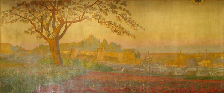 Après le repas, les participants se sont dirigés vers l'ancien Saint-Pierre, rue Saint-Martin, qui avaient été saisis par l'état en 1904 et remis à la Ville de Dreux. Celle-ci a continué à utiliser les bâtiments scolaires en tant qu'école et transformé la chapelle en "musée de la Ville de Dreux". Au 19ème siècle, le réfectoire des élèves avait été décoré, à la demande des Frères, par le peintre Edouard Michon (1848-1943), qui avait peint des fresques sur tous les murs, représentant diverses vues de Dreux. Ces fresques présentent un réel intérêt, à la fois esthétique et historique. La ville de Dreux aimerait les restaurer pour faire une salle de réception de cet ancien réfectoire. |