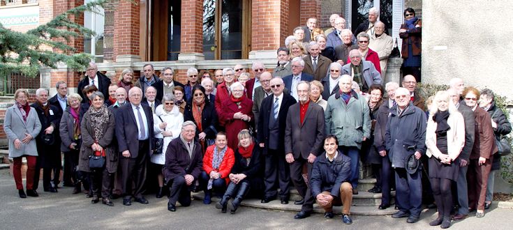 et déposer une gerbe sur les tombes des deux disparus. Comme traditionnellement, la Messe a eu lieu dans la chapelle de l'Institut. Cette année, elle était célébrée par le Chanoine René Le Bars, ancien Curé de l'église Saint-Pierre, actuellement Chanoine du Chapitre de la Cathédrale de Chartres. Jean Loriot était venu avec son orgue portatif pour animer la Messe et Claire Rey dirigeait les Chants. A l'issue de la Messe, l'ensemble des participants s'est prêté à une photo de groupe devant les marches du bâtiment principal. Le Président Bernard Jaguin a ouvert l'Assemblée Générale par une allocution de bienvenue, dans laquelle il a voulu remercier tous les présents, en particulier: