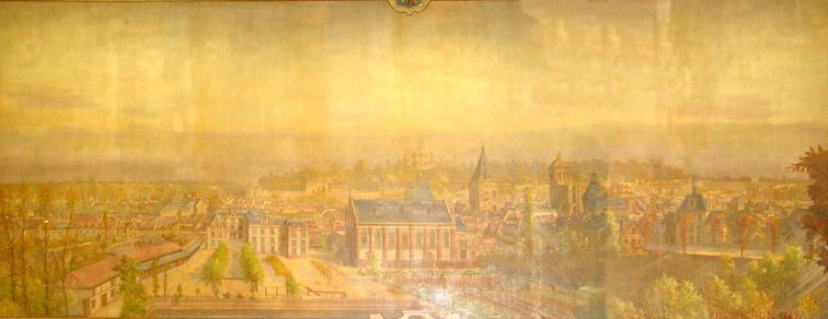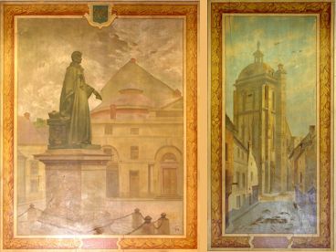 Après le repas, les participants se sont dirigés vers l'ancien Saint-Pierre, rue Saint-Martin, qui avaient été saisis par l'état en 1904 et remis à la Ville de Dreux. Celle-ci a continué à utiliser les bâtiments scolaires en tant qu'école et transformé la chapelle en "musée de la Ville de Dreux". Au 19ème siècle, le réfectoire des élèves avait été décoré, à la demande des Frères, par le peintre Edouard Michon (1848-1943), qui avait peint des fresques sur tous les murs, représentant diverses vues de Dreux. Ces fresques présentent un réel intérêt, à la fois esthétique et historique. La ville de Dreux aimerait les restaurer pour faire une salle de réception de cet ancien réfectoire. |