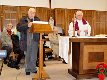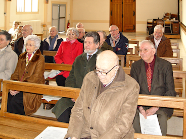 Messe Comme l'année précédente, la Messe avait lieu dans la chapelle de l'Institut, célébrée par le Chanoine René Le Bars, ancien Curé de l'église Saint-Pierre, actuellement Chanoine du Chapitre de la Cathédrale de Chartres. La cérémonie était animée par Jean Loriot venu avec son orgue portatif et par Claire Rey, qui dirigeait les Chants. A la fin de la Messe, le Frère Michel Dumont a pris la parole pour évoquer les six années qu'il avait passées au Pensionnat Saint-Pierre. Il est possible d'écouter le sermon du Chanoine Le Bars, ainsi que l'allocution du Frère Michel Dumont sur en cliquant ici. A l'issue de la Messe, l'ensemble des participants s'est prêté à une séance de photos de groupe devant les marches du bâtiment principal, comme on peut le voir ci-contre. Assemblée Générale C'est devant une cinquantaine de personne que le Président Bernard Jaguin a ouvert l'Assemblée Générale par une allocution de bienvenue, dans laquelle il a remercié tous les présents, en particulier: